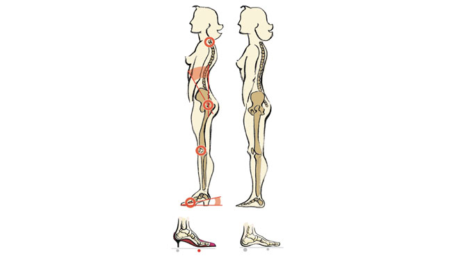 Использование каблуков приводит к неправильной осанке: таз прогинается вперед, усиливаются анатомические искривления позвоночника, что может вызвать боль в спине и повреждение позвонков.